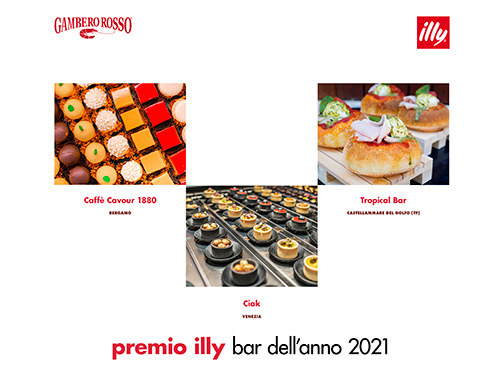 2 i nuovi ingressi nella vetta della classifica, rappresentati dalla Pasticceria Sartori di Erba (Co) e Paszkowski di Firenze; per la categoria Le Stelle, ovvero i locali che per almeno dieci anni consecutivi hanno ottenuto il punteggio di 3 chicchi e 3 tazzine, entrano in classifica la Nuova Pasticceria Lady a San Secondo Parmense (Pr) e 300mila Lounge di Lecce. Aperitivo dell’anno (premio Tramari – Cantine San Marzano) è andato a Patisserie Michele & Co di Perugia. Il Premio Illy Bar dell’Anno in questa edizione è diventato speciale, vista la difficile congiuntura attuale: è stato riservato, difatti, a chi – fatte salve qualità del prodotto e del servizio – ha dato prova di particolare resilienza. Con un bellissimo gioco di squadra sono stati scelti tre diversi bar, tre storie diversissime fra loro ma fortemente simboliche (due al nord, in regioni particolarmente colpite dall’epidemia, e una al sud).
