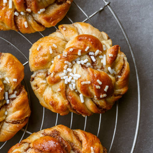 Aprite i baccelli di cardamomo, prelevate i semi e frullateli con lo zucchero. In una planetaria impastate l’uovo, il burro morbido, il latte, lo zucchero, il cardamomo e la buccia d’arancia; poi unite farina, sale, lievito e impastate ancora. Versate l’impasto in una ciotola, copritelo con un panno umido e fatelo lievitare fino al raddoppio. Tagliate l’impasto in 4 parti uguali e create dei rettangoli di circa 20×30 cm e spessi 2-3 mm. Dividete il burro in 4 parti e stendete su ogni rettangolo una parte di burro. Spolverate con zucchero e cannella e arrotolate l’impasto partendo dal lato corto formando un salame. Tagliate i salami a fette di 1,5 cm e disponetele distanziate su una teglia coperta con carta forno. Spennellate con l’uovo sbattuto con la panna (o con il latte), spolverate con zucchero e lasciate lievitare ancora 30 minuti. Cuocete a 180°C per circa 20 minuti.