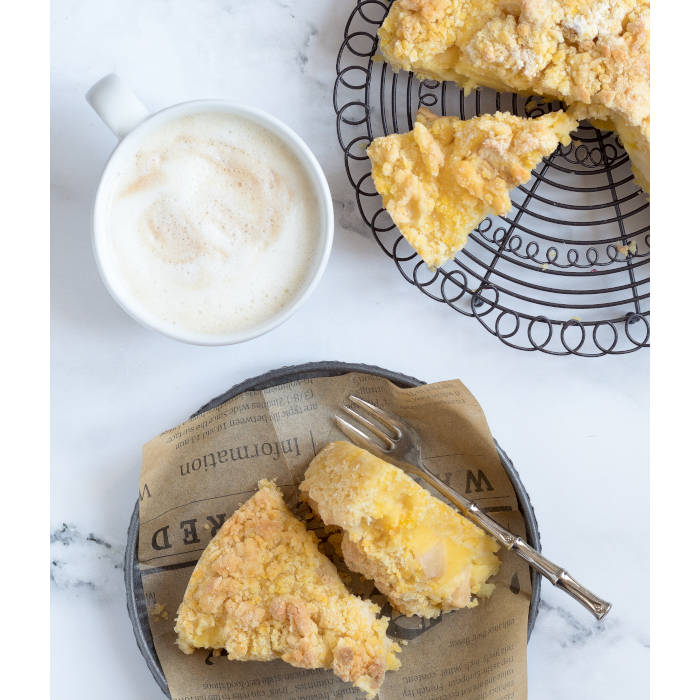 Dividete gli albumi dai tuorli e metteteli in un pentolino con lo zucchero, aggiungete l’amido di mais, un pizzico di vanillina e mescolate versando a filo il latte. Spostatevi su un fornello a fiamma bassa e mescolate fino a fare addensare la crema. Trasferitela in una ciotola e copritela con la pellicola per alimenti che non tocchi la superficie. In una ciotola mettete le uova con lo zucchero, il lievito e la farina. Aggiungete il burro tagliato a pezzetti e con le dita formate un impasto sbriciolato. Imburrate e infarinate una tortiera di diametro 20 cm, mettete alla base metà del composto sabbioso e appiattitelo con le mani. Versate la crema pasticcera, livellatela con un cucchiaio e distribuite le mele pelate e tagliate a pezzetti. Ricoprite la farcitura con il resto di composto sbriciolato e cuocete in forno preriscaldato a 180°C per 35 minuti.