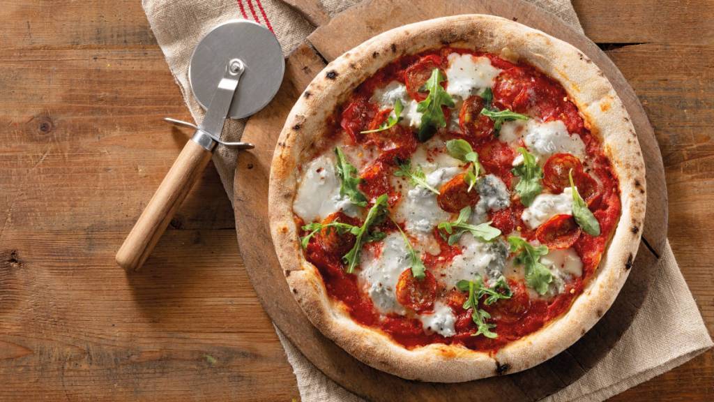 PIZZA ROSSA CON SALAMINO, GORGONZOLA DOP, RUCOLA E PEPERONCINO