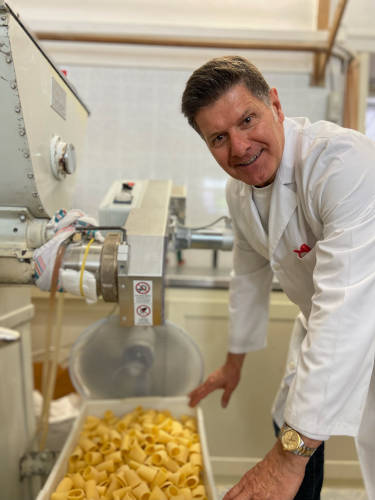 Lui e il padre ogni mattina sono in laboratorio alle prese con i vari impasti insieme ai loro dipendenti: in negozio vanno dopo per affiancare le signore al banco e Catia, compagna di Sergio e talentuosa pasticcera. “Da un po’ di tempo abbiamo aggiunto alla pasta anche dei dolci, per cui ho sempre avuto una grande passione. Abbiamo iniziato a proporli, ottenendo quasi da subito un buon successo. A dire il vero”, sottolinea, “è stata, ancora una volta, una signora inglese a portarci fortuna, perché le prime volte qualche crostata mi restava in vetrina. Poi, dopo che lei le ebbe assaggiate, tornò e le comprò tutte”. Quella alla marmellata di more, senza semini, fatta da lei in stagione con i frutti raccolti da un contadino del posto, è semplicemente deliziosa. L’ho assaggiata, ovviamente, così come tutte le tipologie di pasta proposte da questo scrigno di sapori. E vi assicuro che è tutta roba da gran gourmet.