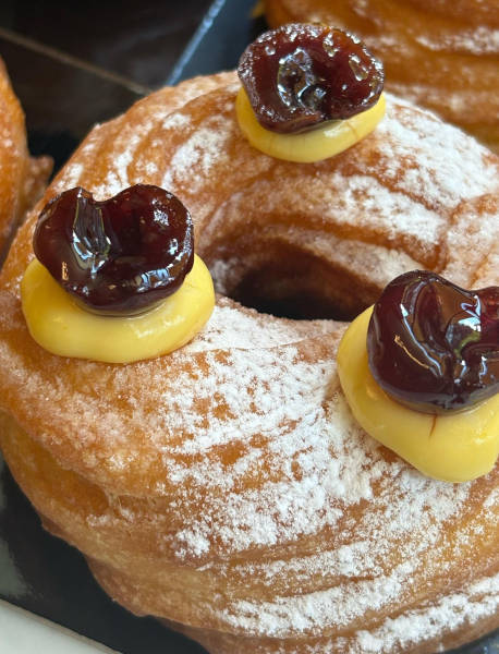 Portate a ebollizione l’acqua, il latte, il burro, il sale e lo zucchero. Togliete dal fuoco e inserite la farina tutta insieme girando con un mestolo. Riportate il tutto sul fuoco (medio) e continuate a girare fino a che non si forma una ‘pellicola’ sul fondo del pentolino. Trasferite, quindi, l’impasto in una planetaria con foglia e lasciate raffreddare a velocità bassa. Quando il composto risulta tiepido, iniziate ad aggiungere a filo le uova gradualmente. Una volta inserite tutte, trasferite l’impasto bignè in una sacca da pasticceria con punta rigata e dressate i bignè di San Giuseppe su rettangoli di carta forno. Immergete i rettangoli di carta forno in olio di semi a 180°C e friggete quindi fino a doratura (il rettangolo di carta forno si staccherà con l’olio bollente). Aspettate che siano freddi, quindi farciteli con crema pasticcera e decoratene con amarene la superficie.